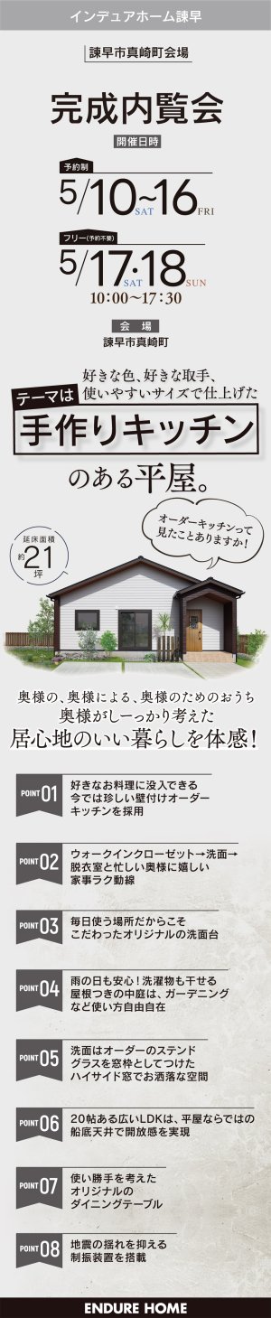 諫早市真崎町で、手作りキッチンがテーマの平屋のモダンハウスの完成見学会を開催致します。